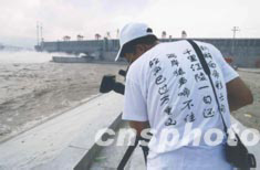 臺灣東森電視臺、中天電視等九家臺灣媒體,和中國新聞社、人民日報等八家著名媒體組成的海峽兩岸聯(lián)合采訪團共二十五名記者,七月中旬來到三峽工地進(jìn)行聯(lián)合采訪。圖為臺灣電視攝像記者在三峽工地拍攝。作者:孫榮剛