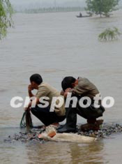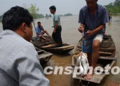 今夏淮河洪水淹沒(méi)千里漁米之鄉(xiāng)的魚(yú)塘,養(yǎng)魚(yú)農(nóng)民血本無(wú)歸;茨系貐^(qū)泄洪區(qū)漁民在洪水中捕撈流失的鮮魚(yú),忍痛以一元錢(qián)三斤賣出。中新社記者:賈國(guó)榮