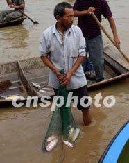 今夏淮河洪水淹沒(méi)千里漁米之鄉(xiāng)的魚(yú)塘,養(yǎng)魚(yú)農(nóng)民血本無(wú)歸。安徽省阜陽(yáng)縣王家壩的漁民和村民目前抓緊撒網(wǎng)捕撈流失之魚(yú),略補(bǔ)生活損失。中新社記者:賈國(guó)榮
