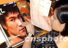 圖為展會(huì)上參觀者購(gòu)買李小龍紀(jì)念雜志。