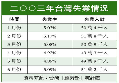 據臺灣媒體報道稱,6月份島內的廣義失業(yè)率7.12%,也較5月增加0.03個百分點。據了解,6月就業(yè)人數為954.2萬人,失業(yè)人數51.2萬人,較5月增加13000人,主要是因為社會新鮮人出來找工作而失業(yè)居多。據相關官員稱,受到非典影響,6月畢業(yè)生還有很多尚未開始找工作,企業(yè)主也未真正開始征人,因此必須再看7月統(tǒng)計數字。