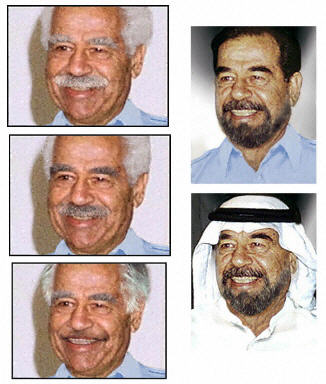據(jù)路透社報(bào)道,這些照片包括通常蓄髭且深發(fā)的薩達(dá)姆若留胡須、把臉刮干凈、白發(fā)或灰發(fā)的模樣,還有一張為他戴著傳統(tǒng)阿拉伯頭巾的樣子。這些照片都已經(jīng)發(fā)給正在伊拉克全力搜索薩達(dá)姆的軍隊(duì)。