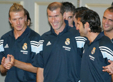 當?shù)貢r間8月4日上午,日本方面為皇馬舉行了隆重的歡迎儀式,圖為貝克漢姆和齊達內(nèi)等在發(fā)布會上。
