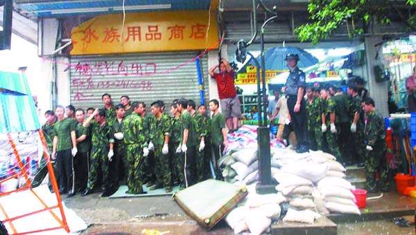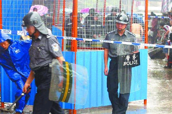 據(jù)武副場(chǎng)長(zhǎng)介紹,8月5日下午3時(shí)15分左右,黃沙市場(chǎng)有關(guān)人員得知此事后,派出保安將紅線界上的店鋪移走。昨天上午8時(shí)左右,市水產(chǎn)供銷公司一方60多名身穿迷彩服的男子手持木棍、鋼管等物來(lái)到黃沙市場(chǎng)內(nèi)。市場(chǎng)內(nèi)的保安得知后就迅速向上級(jí)報(bào)告,并及時(shí)向荔灣區(qū)多寶路派出所報(bào)警。當(dāng)派出所警察趕至現(xiàn)場(chǎng)時(shí),勸說(shuō)對(duì)方放下木棒及鋼管時(shí),遭到對(duì)方拒絕。警察又迅速向110求援,隨后就有10多名防暴警察趕至現(xiàn)場(chǎng),用盾牌將雙方人員隔開(kāi)。