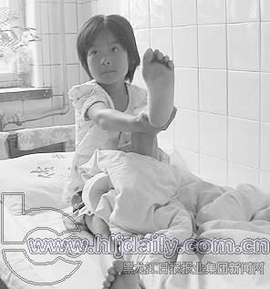 馮佳緣今年11歲,在齊齊哈爾市和平二小讀書,開學念四年級,是這次芥子毒劑桶泄露中毒事件中第35個入203醫(yī)院治療的患者。也是目前事故的第11現(xiàn)場———齊齊哈爾市第五中學現(xiàn)場惟一一個中毒者。記者在病房見到她的時候,醫(yī)生正在給她換藥、清創(chuàng)。醫(yī)生一再安慰她別怕疼。但在藥快換完的時候,馮佳緣還是沒能忍住、哭出了聲兒。換完藥后,馮佳緣告訴記者,4日晚上,她只是在5中的操場上路過,結果第二天腳起泡了,然后去住院,直到前天她看到報紙后,才轉到203醫(yī)院救治,現(xiàn)在馮佳緣的病情已稍有好轉。