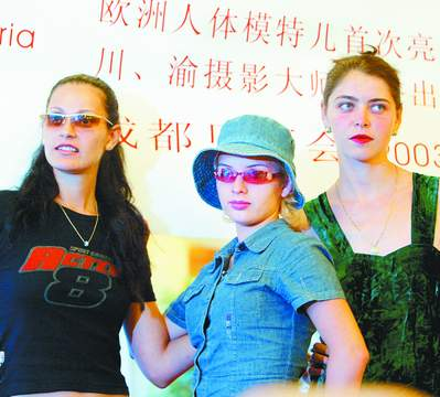 三名人體模特剛一露面,就被蓉城媒體記者和順勢抬起“大炮”開拍的攝影家們“閃”得頭昏眼花。模特們顯然很專業(yè),馬上擺出曲線畢露的Poss和職業(yè)的笑容。記者略數(shù)了一下,“長槍短炮”的數(shù)量竟然多過在場人數(shù)。
