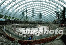 在四川省著名風(fēng)景區(qū)九寨溝旁邊二十公里的甘海子森林里,今秋時節(jié)正在為明年的世界環(huán)境與發(fā)展論壇建造國際會議度假中心。圖為全透明玻璃結(jié)構(gòu)的溫泉中心工地。中新社記者:賈國榮