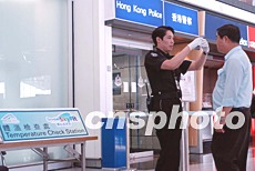 香港衛(wèi)生署對新加坡出現(xiàn)SARS疑似病例發(fā)表聲明,將密切留意,保持高度戒備,圖為九日香港國際機場嚴(yán)格測量體溫措施到位不松懈。作者:潘索菲