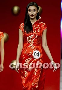 第五十三屆世界小姐中國(guó)總決賽彩排二十日在三亞大劇院舉行,圖為四號(hào)選手關(guān)琦身著大紅旗袍出場(chǎng),展示中國(guó)女性傳統(tǒng)美麗風(fēng)采。中新社記者:毛建軍