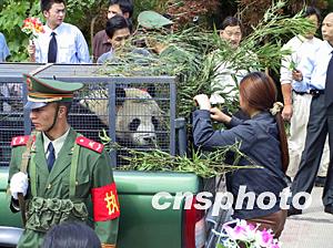 中午二時許,八只國寶大熊貓抵達雅安碧峰峽研究基地,藏漢民眾和碧峰峽研究基地的工作人員手持鮮花、彩旗隆重夾道歡迎國寶平安抵達。歡迎儀式結束之后,八臺大熊貓專車往新居行近,武警戰(zhàn)士將這八只大熊貓?zhí)нM了它們的“豪華別墅”。這八只大熊貓忽閃忽閃的眼神,顯示著它們的新奇與不安。畢竟這是一個陌生的世界。大熊貓遷入新居時,一些大熊貓發(fā)怪叫聲,有的在房里轉來轉去,但是,當護養(yǎng)人員將竹子、蘋果送給它們吃時,即刻恢復了常態(tài)。