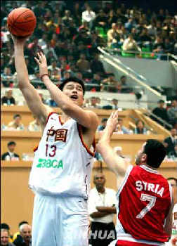 在全場(chǎng)觀眾的期待中,姚明首發(fā)出場(chǎng),與張勁松、李可、朱芳雨、劉煒攜手上陣。緊逼防守和快速的反擊屢屢奏效,小巨人幾次漂亮的扣籃和蓋帽更是贏得滿場(chǎng)喝彩。相比之下,敘利亞隊(duì)顯得畏手畏腳,過(guò)于保守,完全沒(méi)有了上屆亞錦賽歷史性地打入四強(qiáng)的斗志。僅第一節(jié)比賽,中國(guó)隊(duì)就以三十二比九遙遙領(lǐng)先,姚明獨(dú)得十二分。