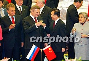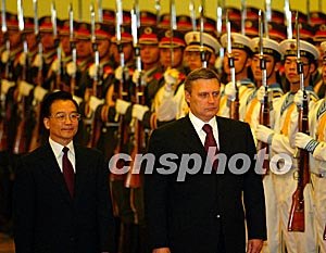 國(guó)務(wù)院總理溫家寶今天上午在人民大會(huì)堂北大廳主持儀式,歡迎出席完上海合作組織成員國(guó)總理第二次會(huì)晤的卡西亞諾夫正式訪華。