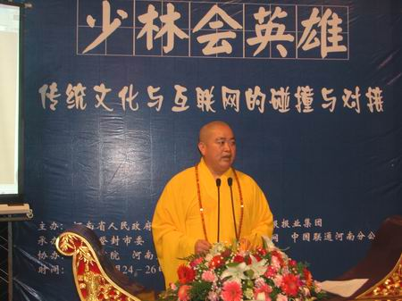 少林寺方丈釋永信在少林寺山門前主持盛大的歡迎儀式。釋永信在致歡迎詞時(shí)說:“嵩山論劍--中國互聯(lián)網(wǎng)新聞宣傳高峰論壇在少林寺召開,少林古剎古老的文明和現(xiàn)代科技將在這里碰撞與對接。