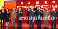 香港行政長官董建華九月二十六日出席香港新聞界慶祝中華人民共和國成立五十四周年國慶酒會。圖為董建華(右四)等向嘉賓祝酒。中新社圖