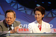 九月二十六日,2003年國際大專辯論會(huì)決賽在北京中央電視臺(tái)演播廳舉行,諾貝爾獎(jiǎng)獲得者楊振寧(左)擔(dān)任辯論會(huì)的點(diǎn)評(píng)嘉賓。中新社記者:盛佳鵬