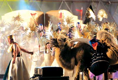 當(dāng)晚演出的高潮出現(xiàn)在第二幕第二場。在雄壯有力的凱旋進行曲聲中,兩千名由武警戰(zhàn)士扮演的身穿戰(zhàn)袍的勇士邁著整齊的步伐走過這個世界上最大的舞臺,上千名歡慶勝利的群眾在舞臺上載歌載舞,而繳獲的戰(zhàn)利品——駱駝、老虎、獅子等動物明星們的出場以及在體育場看臺四周齊放的絢麗的煙花更增添了歡慶的節(jié)日氣氛。這時,工人體育場一下子沸騰了,觀眾們被眼前盛大的場景深深感染了,臺上臺下歡呼聲響成一片,首屆北京國際戲劇演出季掀起了第一個高潮。