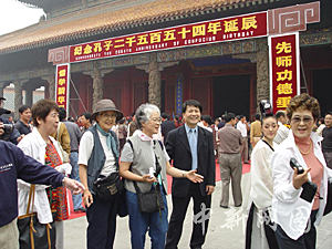 孔廟大成殿前懸掛著的“紀念孔子兩千五百五十四年誕辰”橫幅和“先師功德垂青史,儒學精華照五洲”的對聯(lián),表達出海峽兩岸孔子后裔及海內(nèi)外儒學信仰者的共同心愿。孔子第七十七代嫡孫孔德懋受在海峽彼岸臺灣的孔德成先生的委托,與家人一起來到大成殿前,祭拜祖先。眾多海內(nèi)外孔子后裔與來自印尼、韓國、馬來西亞、美國、香港、臺灣、澳門等十多個國家和地區(qū)的祭孔參禮團的數(shù)百名來賓祭拜了“至圣先師”——孔子。