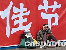 中國大陸在今春抗擊“非典”過后又恢復(fù)節(jié)日長假。圖為北京一名辛勞的女士在采購大批節(jié)日商品后,坐于擁擠的市場外小歇。中新社記者:鄒憲