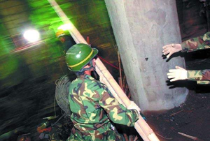 昨天晚上8時(shí)30分,記者在搶險(xiǎn)現(xiàn)場守侯,一名因疲勞過度的三水拆船廠的搶險(xiǎn)工人從工地走出來,記者立即圍上前詢問現(xiàn)場搶險(xiǎn)救援的情況。該工人說,他們是昨天上午11時(shí)許接到拆船廠負(fù)責(zé)人的指示,要他們立即集合前往新會一發(fā)生倒塌事故的建筑工地上救人,于是他們穿上工作服就來了。據(jù)介紹,他們大約來了30人左右,分為三班倒。他們實(shí)施搶救的主要步驟時(shí),首先將高空中墜落地面的大約100多平方米的鐵板用電焊將他們燒開,用大型的吊車將鐵板吊開,然后再將壓在地下的工人從鐵板下“拔”出來。主要的困難是鐵板從高空墜下,其速度非常快,在慣性的作用下,將眾多的雜物如竹子、木頭、鐵棍等夾雜在其中。預(yù)計(jì)下面被埋的還有10人左右,他們正與搶險(xiǎn)的其他工人爭分奪秒,估計(jì)將通宵搶險(xiǎn)。