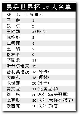 盡管薩姆索諾夫因故放棄參賽,孔令輝也由于排名限制而無緣與會,然而參賽的十六名選手已可代表當(dāng)今男子乒壇的最高水平。