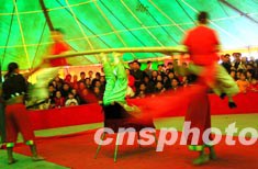 “十一”長(zhǎng)假期間,許多游客來到雜技之鄉(xiāng)河北吳橋一睹雜技風(fēng)采。這里除了傳統(tǒng)的吳橋雜技外,還增加許多新組合的節(jié)目。圖中利用云貴民族舞蹈中的細(xì)節(jié)與雜技蹬凳結(jié)合編排的表演,使觀眾在輕松娛樂中體會(huì)雜技高超的技藝。中新社記者:王麗南