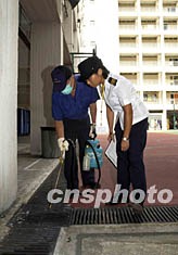 香港當(dāng)局為加強(qiáng)預(yù)防登革熱的工作,教育統(tǒng)籌局及食環(huán)署現(xiàn)正進(jìn)行為期一星期的巡視學(xué)校行動(dòng)。圖為食環(huán)署人員十六日在梁式芝書院操場(chǎng)的水渠噴灑蚊油。中新社圖