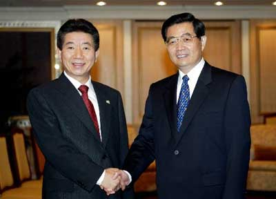 胡錦濤對盧武鉉說:今年7月你訪問中國時,我們雙方?jīng)Q定建立中韓全面合作伙伴關(guān)系,并確定了雙邊合作的重點領(lǐng)域。在這一精神的推動下,兩國在各方面的合作都取得了新的進展。兩國領(lǐng)導(dǎo)人經(jīng)常見面體現(xiàn)了我們之間的良好關(guān)系。目前,兩國經(jīng)貿(mào)合作發(fā)展迅速,今年1月至9月,雙邊貿(mào)易額已達440億美元。我們認(rèn)為,中韓關(guān)系的順利發(fā)展,友好合作的不斷擴大,為中韓兩國人民帶來了實實在在的利益。希望雙方進一步共同努力,積極開拓,將中韓全面合作伙伴關(guān)系落到實處。