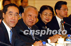 十月二十七日,滬港經(jīng)貿(mào)合作會議在香港禮賓府舉行,圖為香港特別行政區(qū)行政長官董建華、財政司司長唐英年、律政司司長梁愛詩出席該會議。中新社記者:潘索菲