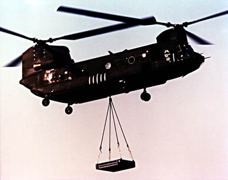 在越南戰(zhàn)爭中,CH-47A主要用于為陸軍部隊(duì)運(yùn)送兵員物資,特別是在為炮兵吊送火炮到不便進(jìn)入的復(fù)雜地帶,為前線輸送油料(一次外吊2個(gè)各500加化容量的軟油箱)和回收近降或受傷在外的直升機(jī)(一次可吊一加UH-1)方面獲得好評。在越南南方,當(dāng)以200千米/小時(shí)的速度全速低空飛行時(shí),基本不需要?jiǎng)e的飛機(jī)的護(hù)航。但渦輪式發(fā)動(dòng)機(jī)在高山、高溫季節(jié)中出力不足,影響了性能的正常發(fā)揮。曾有3架CH-47A被改為重火力空中護(hù)航機(jī),共裝備7.7毫米機(jī)槍7挺、20毫米機(jī)炮3門、40毫米擲彈筒一具和火箭發(fā)射巢1具,型號(hào)為ACH-47A。