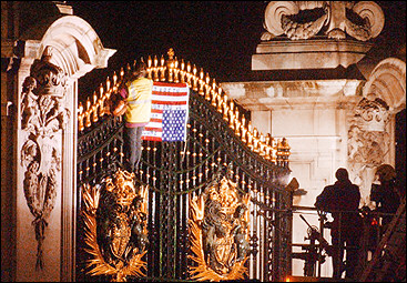 美國總統(tǒng)布什訪問英國前夕,一名英國婦女17日竟攀爬白金漢宮大門以示抗議。