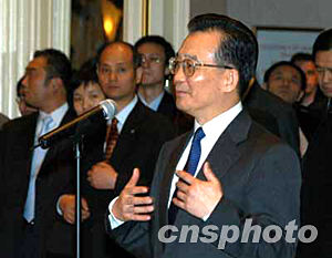 美東時(shí)間十二月七日下午,中國(guó)總理溫家寶甫抵紐約,即接見(jiàn)華僑華人、留學(xué)生和中資機(jī)構(gòu)代表。溫家寶說(shuō),大家冒著嚴(yán)寒風(fēng)雪,守候在這里好幾個(gè)小時(shí),歡迎我和我的同事。大家的這份情意,不僅是給我和同事的,更是給祖國(guó)和人民的。他代表中國(guó)人民和中國(guó)政府,向旅居在美國(guó)的華僑、華人、留學(xué)生,向來(lái)自香港、澳門(mén)和臺(tái)灣的同胞,向領(lǐng)館的工作人員,致以親切的問(wèn)候和良好的祝愿。隨后他向前方和左右三鞠躬,感謝僑胞們的熱情歡迎。作者:陳建