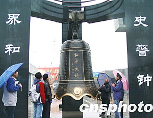 由南京鋼鐵集團澆鑄的“和平大鐘”十二月十一日正式落戶南京大屠殺遇難同胞紀念館,以銘記歷史教訓(xùn),祈禱世界和平。大鐘高3米,寓意紀念30萬遇難同胞;總重量6.6噸,表示大鐘于南京大屠殺遇難者66周年祭日鑄建;下擺口徑為1.937米,意為日軍全面侵華及南京大屠殺發(fā)生的年份。該鐘外形仿明式青銅古鐘樣式,鐘體正面是著名書法家啟功書寫的“和平大鐘”鐘名,背面刻有“前事不忘、后事之師,以史為鑒、開創(chuàng)未來”16個大字,兩側(cè)分別刻有銘文和浮雕。作者:丁梅