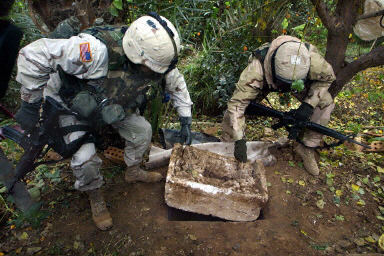 12月15日,在伊拉克提克里特附近,美軍第四步兵師士兵展示薩達(dá)姆被捕時藏身的地洞。
