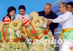 香港特區(qū)行政長(zhǎng)官董建華、環(huán)境運(yùn)輸及工務(wù)局局長(zhǎng)廖秀冬,12月20日在九廣西鐵啟用典禮上主持啟用儀式為醒獅點(diǎn)睛。中新社記者:洪少葵