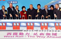 香港九廣西鐵12月20日正式通車,圖為行政長(zhǎng)官董建華、環(huán)境運(yùn)輸及工務(wù)局局長(zhǎng)廖秀冬、九廣鐵路主席田北辰等嘉賓在錦上路站主持啟用儀式。中新社記者:洪少葵
