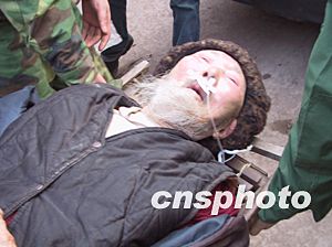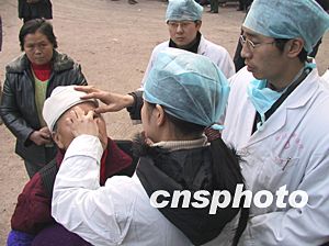 重慶市開縣高橋鎮(zhèn)的川東北氣礦一礦井天然氣“井噴”事故受到控制后,醫(yī)務(wù)人員繼續(xù)救治一受傷老人。作者:鄒輝  醫(yī)務(wù)人員連日為受傷者檢查眼睛等受傷處。作者:鄒輝
