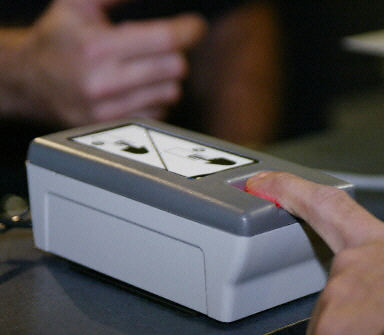 2004年1月5日,在洛杉磯國(guó)際機(jī)場(chǎng),美國(guó)海關(guān)及邊境安全部門(mén)的官員展示新的指紋識(shí)別及拍照系統(tǒng)。從5日起,美國(guó)全境將推廣使用該系統(tǒng),對(duì)進(jìn)入美國(guó)的外國(guó)游客進(jìn)行身份識(shí)別。