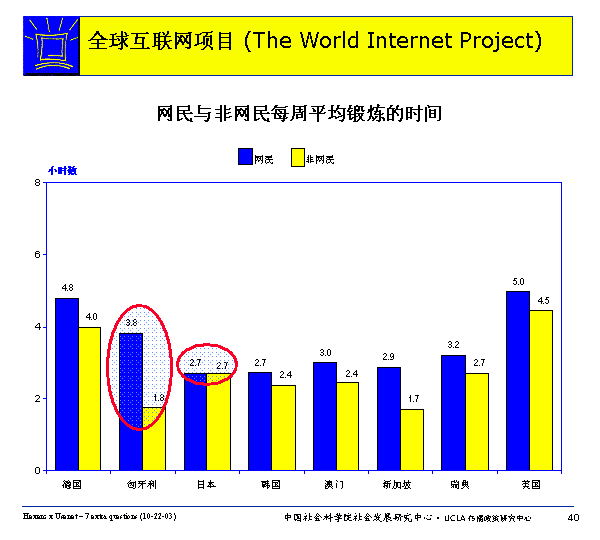 網(wǎng)民平均每周的鍛煉時間多于非網(wǎng)民,日本除外。