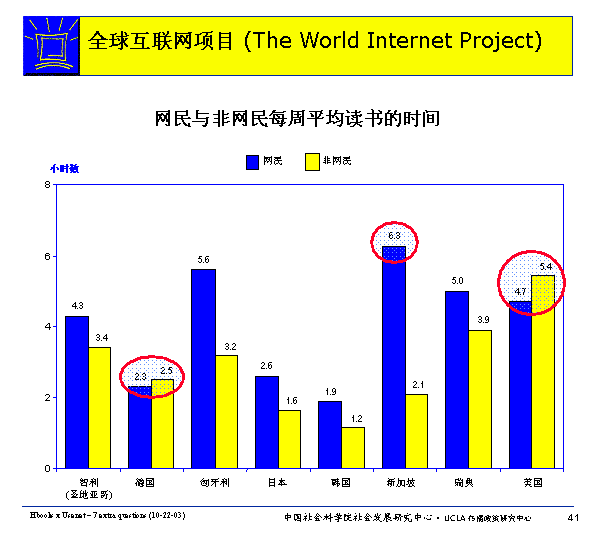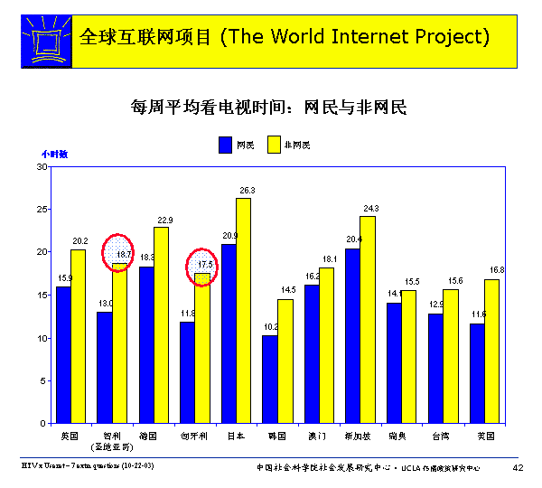 在所有調(diào)查的國家里,網(wǎng)民平均每周與朋友交往的時間多于非網(wǎng)民。而只有在美國和德國,網(wǎng)民和非網(wǎng)民與朋友交往的平均時間基本是一致的。