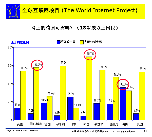 韓國網(wǎng)民最信任網(wǎng)上信息,69.7%的網(wǎng)民認(rèn)為網(wǎng)上的大部分信息都是可靠的。