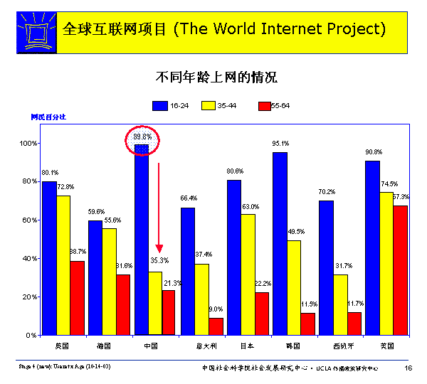 在WIP所有國家里,隨著年齡增加,網(wǎng)民比例減少。某些國家的老年人比其他國家的更可能上網(wǎng),例如:美國57.3%的55-64歲之間的人上網(wǎng)。而中國網(wǎng)民中的年齡差異則非常明顯。由此可見,年齡是影響上網(wǎng)的一個重要因素。