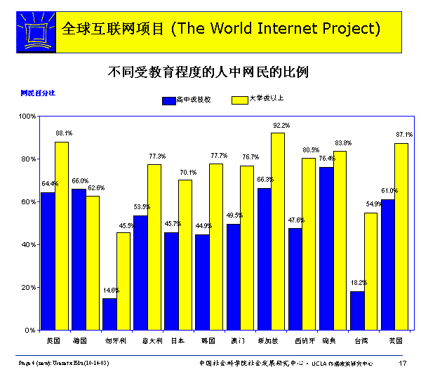 在WIP所有國家里,除德國外,有大學或以上學歷的人比高中或職業(yè)學校學歷的人更可能上網(wǎng)?梢,受教育程度也是影響上網(wǎng)的重要因素。