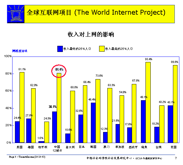 在所有WIP國家里,最富的四分之一人口比最窮的四分之一人口更傾向于上網(wǎng)(這里,中國數(shù)據(jù)中最富的四分之一網(wǎng)民指(家庭年收入超過5000元者),而最窮的四分之一網(wǎng)民指家庭年收入低于1600元者)。由此可見,經(jīng)濟(jì)收入是影響人們上網(wǎng)的重要因素。