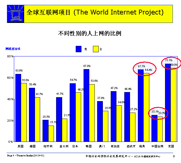 在WIP所有國家里,男性比女性更可能上網(wǎng)。男性和女性上網(wǎng)比例的差異因國家而異,瑞典、臺(tái)灣和美國的男女上網(wǎng)比例幾乎沒有差異,而意大利、新加坡和西班牙的男女上網(wǎng)比例則差異很大。