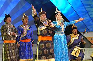 最為奇特的是來(lái)自?xún)?nèi)蒙古大草原的男女兩組呼麥歌手,他們的呼麥唱法,起源于宗教,已有近兩千年歷史。一位歌手一張嘴,同時(shí)發(fā)出高、中、低三種聲音,分別表示對(duì)天、地、神的尊敬。這種獨(dú)特古老的演唱方式,曾盛行于蒙古大汗的宮庭,后來(lái)才逐漸傳入民間。