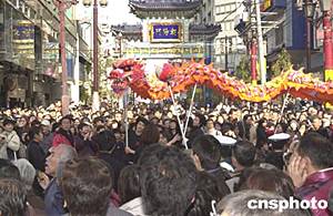以著名的日本橫濱中華街為終點(diǎn)站的“未來港”地鐵新線二月一日正式開通,橫濱華僑在街頭以傳統(tǒng)舞龍慶賀這個(gè)著名華埠有史以來首次開通地鐵。作者:王健