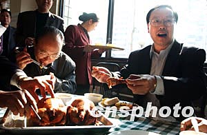 記者看到,自助餐區(qū)準備的菜不僅有酸辣黃瓜、尖椒皮蛋,蒜蓉油菜,還有涼拌雞胗、宮保雞丁、香炸雞翼、西紅柿雞蛋。杜青林先夾了一些涼拌雞胗和酸辣黃瓜,他說,“平時比較喜歡吃雞肉,所以今天多吃點雞”。一邊說著,一邊往自己的盤子里夾了宮保雞丁、西紅柿雞蛋,最后他還揀了三塊香炸雞翼放在盤中。