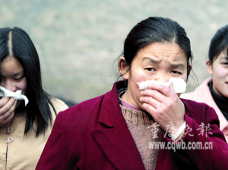 昨日9時許,重慶天原化工總廠發(fā)生泄漏事故,據(jù)調(diào)查小組分析后認(rèn)為,泄漏的是氯化氫氣體,污染了大水井合作社與雞心石合作社,附近居民先后出現(xiàn)流淚、咳嗽等現(xiàn)象。苗兒石小學(xué)500多名師生當(dāng)時正在上興趣課,9時30分左右,一種霧狀刺鼻氣體開始在全校彌漫開來,并幾乎將全;\罩,“突然來的氣體熏得睜不開眼了。老師忙喊快走快走!”補(bǔ)課的學(xué)生緊急疏散。該校三年級一位姓張的小朋友說,跑出教室才發(fā)現(xiàn),全校的同學(xué)都捂著鼻子往家跑了。
