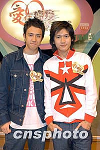 樂壇組合Boy'Z兩名成員關(guān)智斌(Kenny)、張致恒(Steven)(右起)3月2日出席香港電臺(tái)戲劇節(jié)目《愛在瘟疫蔓延時(shí)》啟播典禮。作者:鄧慶樂
