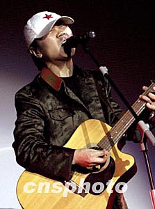 三月五日晚,德國“搖滾教父”林登貝格和中國“搖滾教父”崔健在北京展覽館劇場聯(lián)袂出演多媒體音樂劇《大西洋故事》。圖為崔健自彈自唱搖滾歌迷耳熟能詳?shù)慕?jīng)典歌曲。作者:高遠